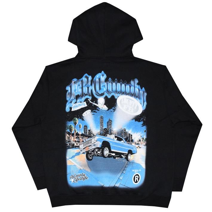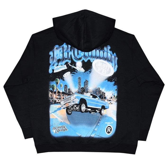 チカーノファッションブランドの金字塔とも言える【FB COUNTY】のバックサイドにブランド公式のグラフィック・デザインが施された13オンスのヘビィウェイト仕様のプルオーバーHOODIE☆