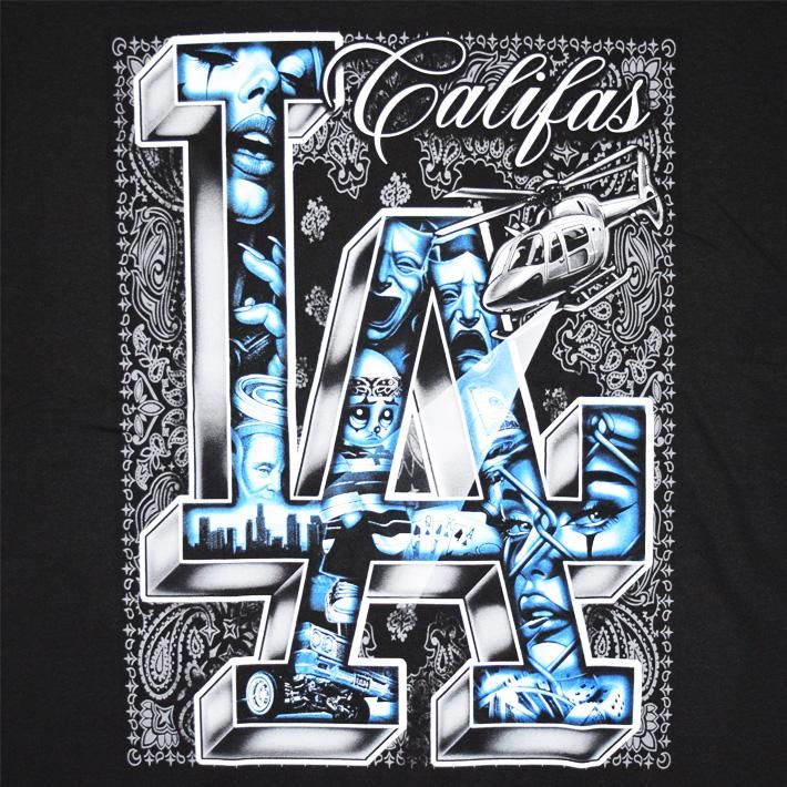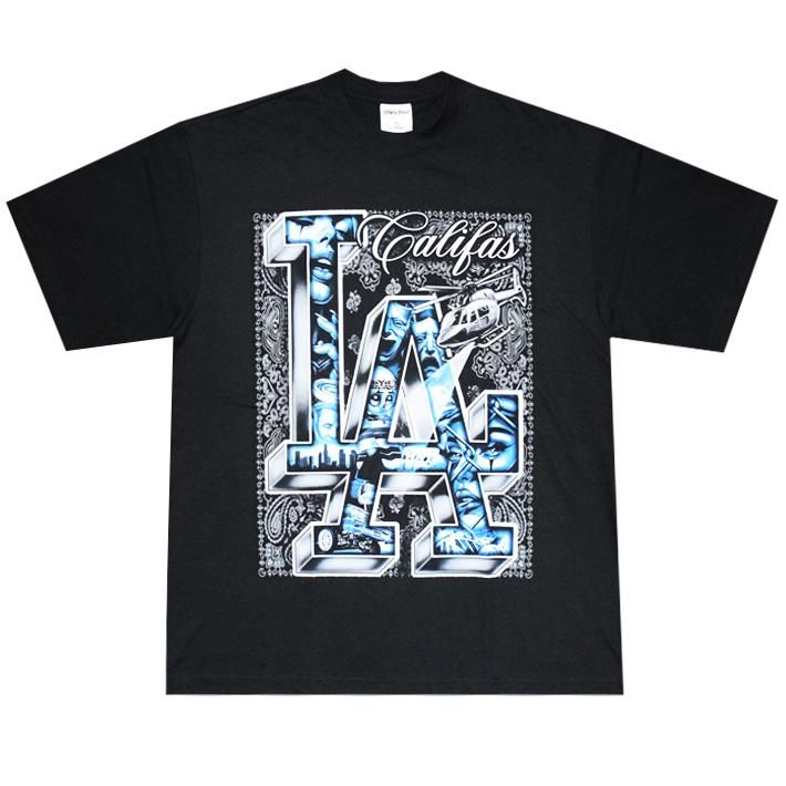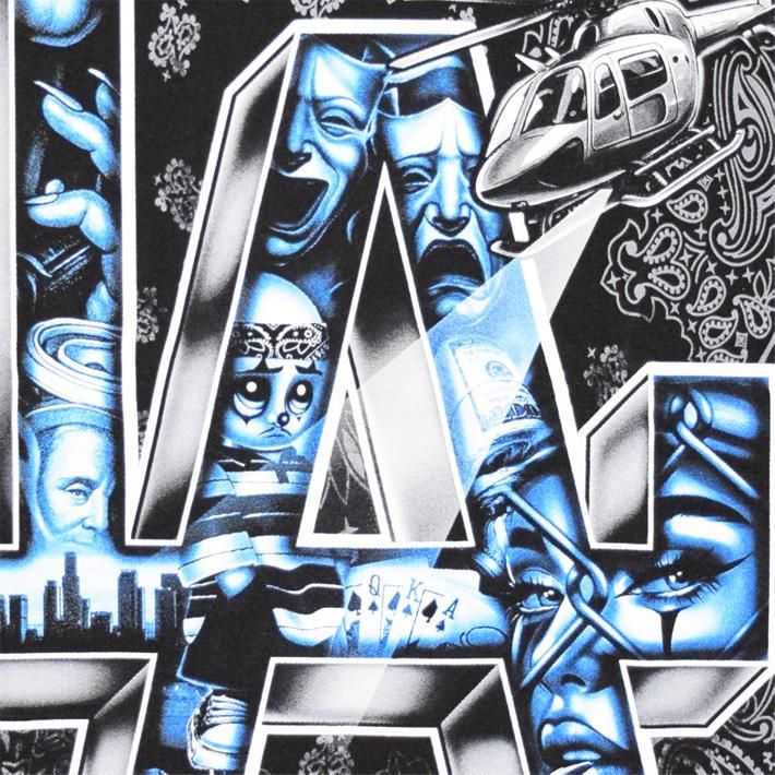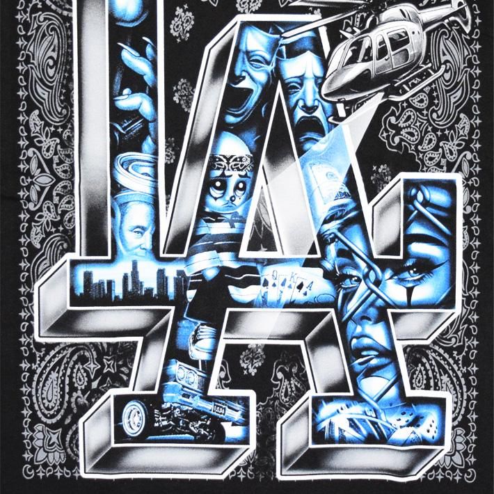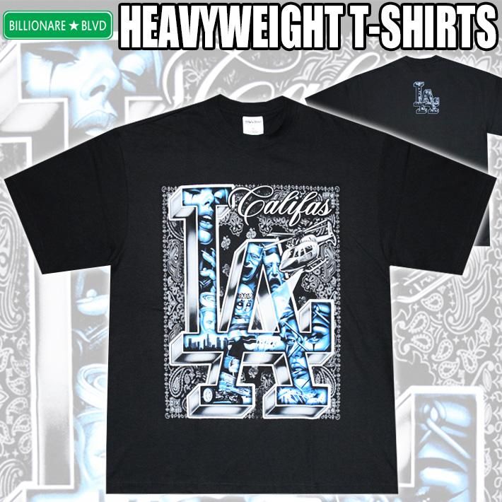 背景にバンダナ柄(ペーズリー)、GHETTO BIRD(へりコプター)、立体なLAの文字の中にCHOLO ARTを詰め込み、とことんギャングスタなデザインに仕上げた【BILLIONARE BLVD】産HEAVYWEIGHT Tシャツ☆